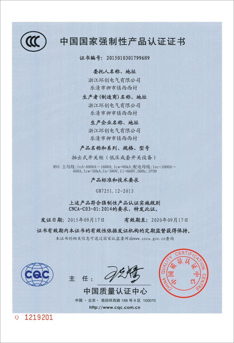 MNS抽出式開(kāi)關(guān)柜3C證書(shū)